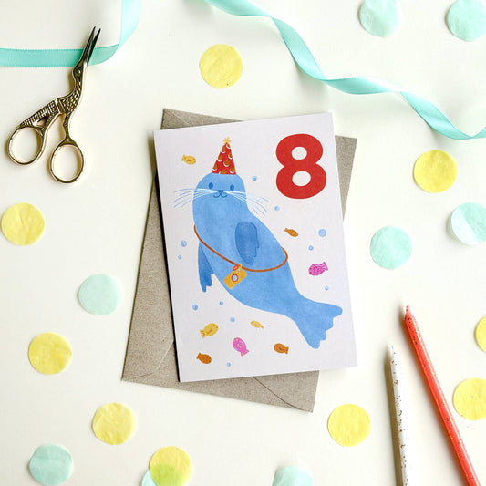 Age 8 Seal Birthday Card - Kids Cute 8th Milestone Party